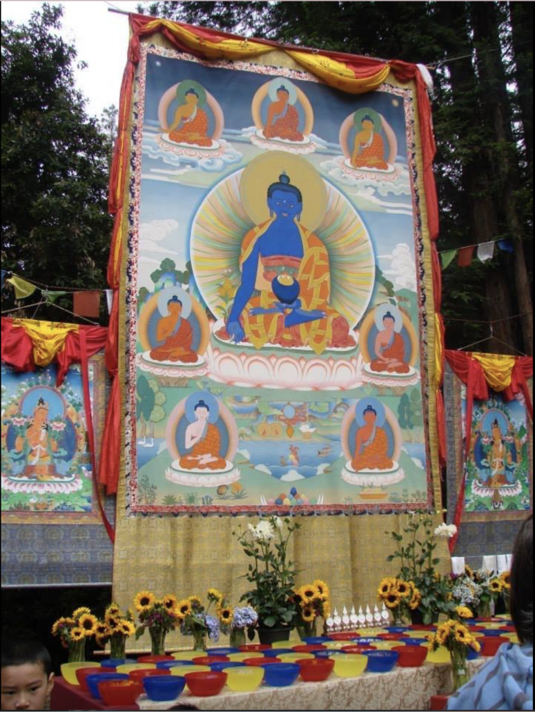 - 9:00am – 9:30am: Raising of the 24 ft Medicine Buddha thangka at the Wish Fulfilling Temple (available on Zoom)